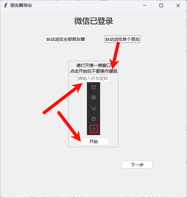 该软件提供绿色版,双击打开后可选择自动浏览全部朋友圈或者选择自动浏览单个朋友。
