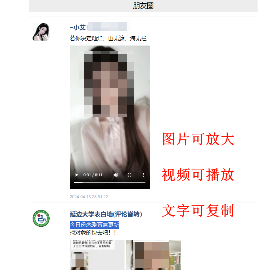 导出的朋友圈页面样式完全模拟真实的朋友圈,不仅文字可以复制,而且在页面中的图片和视频也可以进行放大显示原图和播放操作!