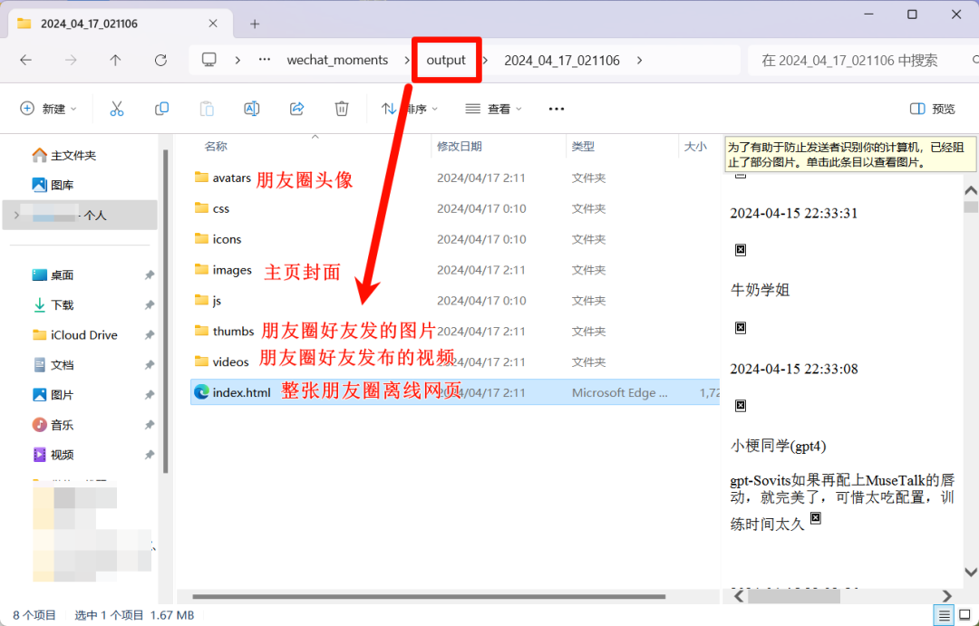 导出完成后,生成的视频、图片和相关文件将保存在名为“output”的文件夹内。包含了头像、图片、视频和网页等不同类型的保存文件。