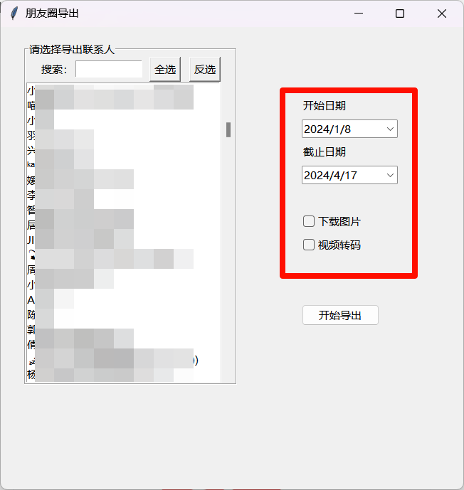 在这一步中,需要选择要导出哪些人的朋友圈。如果想要全部导出,请点击“全选”选项。如果只想导出特定人的朋友圈,可以使用名称搜索并导出。