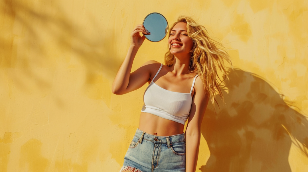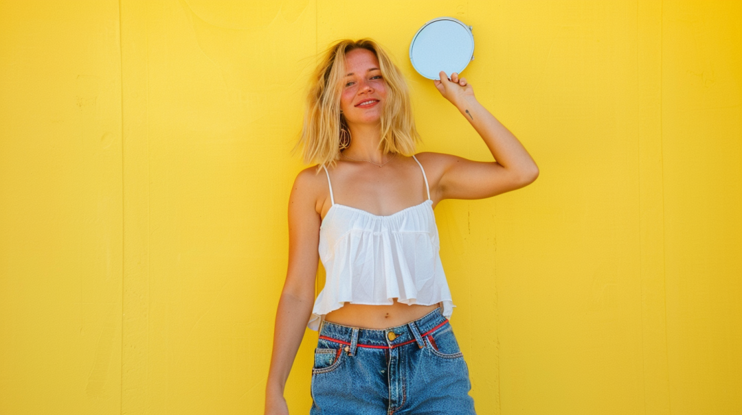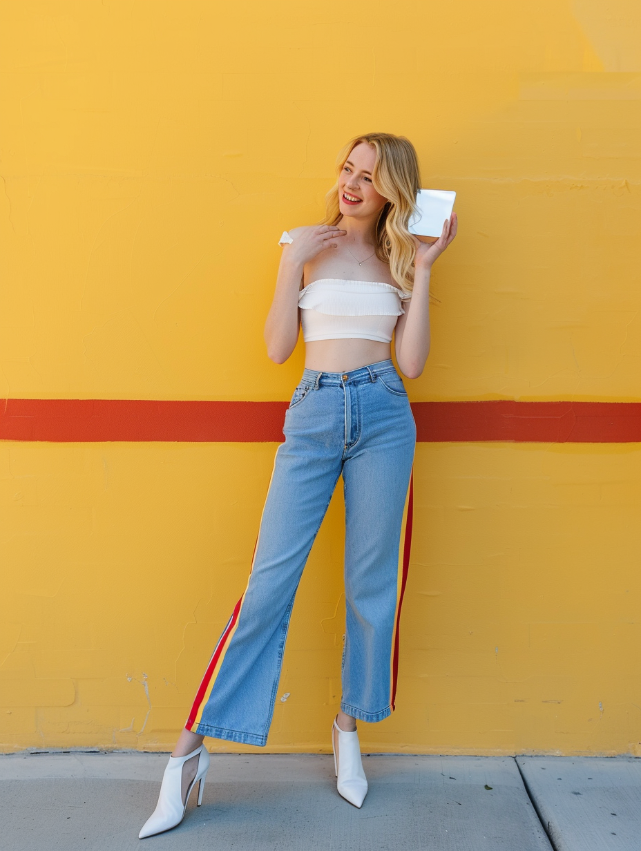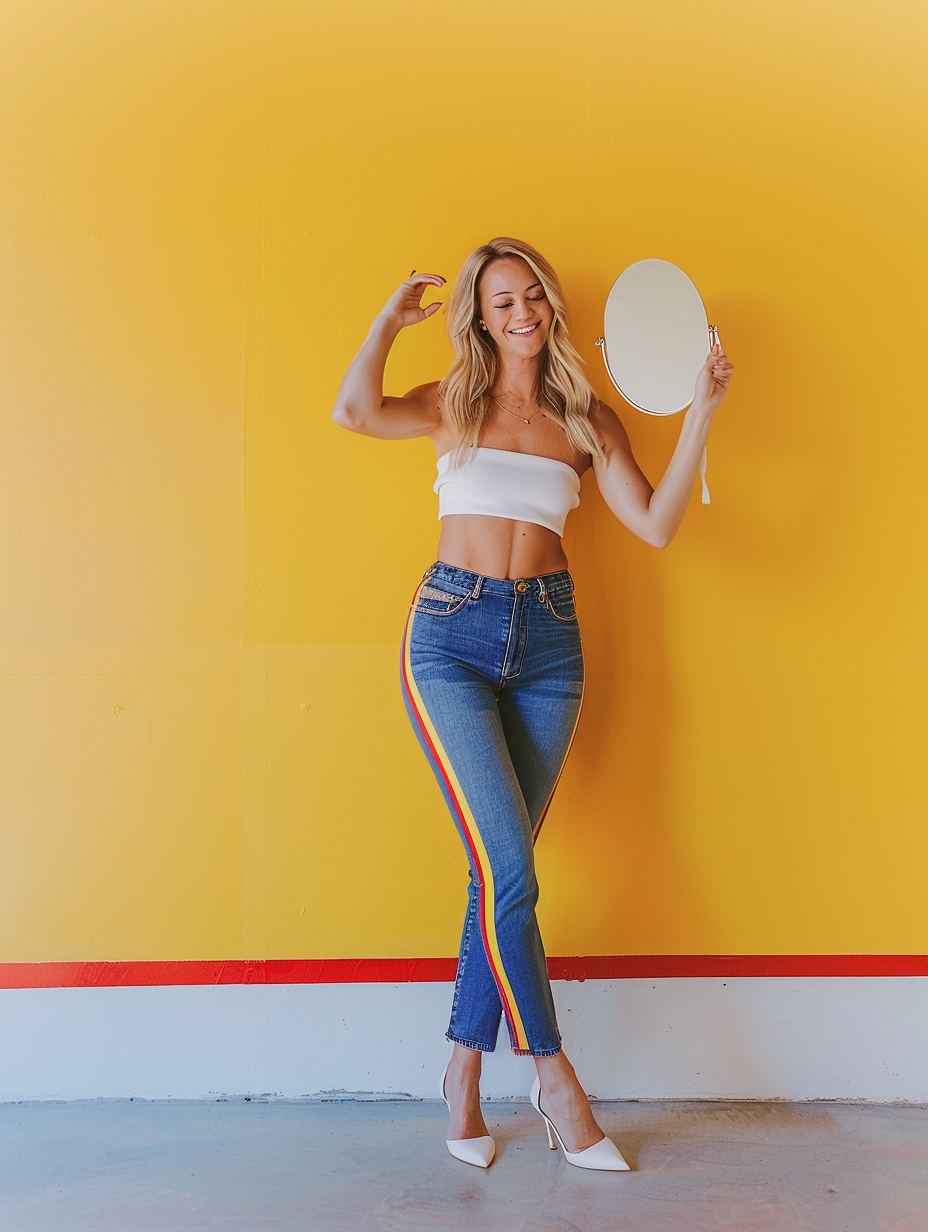 一位金发女性站在黄色墙壁前,穿着一件白色抹胸,下半身是一条蓝色牛仔裤,上面有条红色条纹。她右手拿着镜,微笑着看着右上方。全身照,脚穿白色高跟鞋,她的头发自然地垂在肩上,看起来非常轻松愉悦。整体氛围很悠闲舒适。