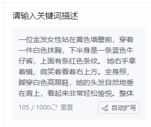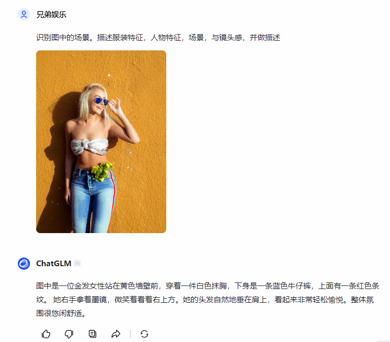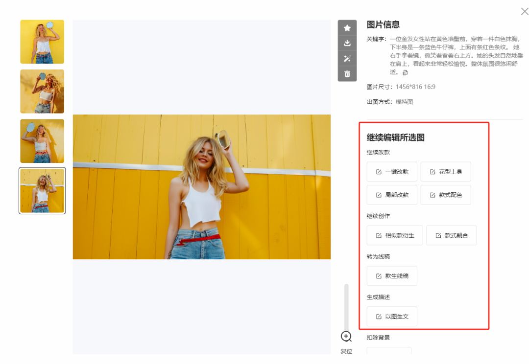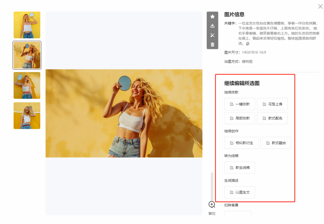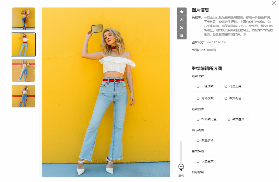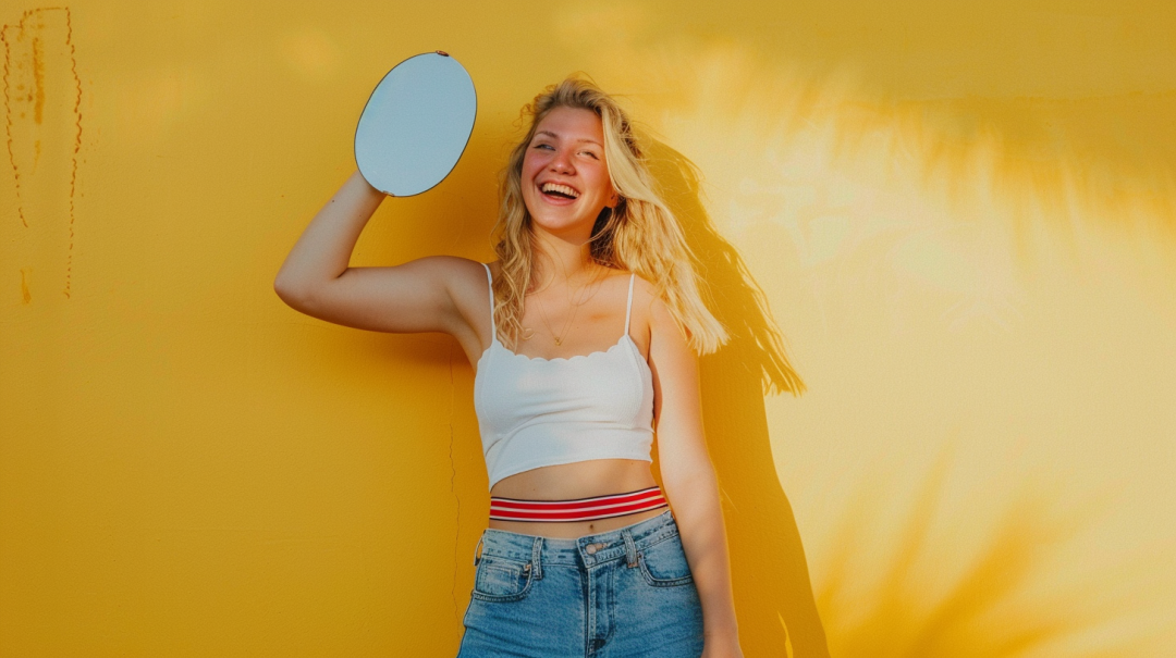 一位金发女性站在黄色墙壁前,穿着一件白色抹胸,下半身是一条蓝色牛仔裤,上面有条红色条纹。她右手拿着镜,微笑着看着右上方。全身照,脚穿白色高跟鞋,她的头发自然地垂在肩上,看起来非常轻松愉悦。整体氛围很悠闲舒适。