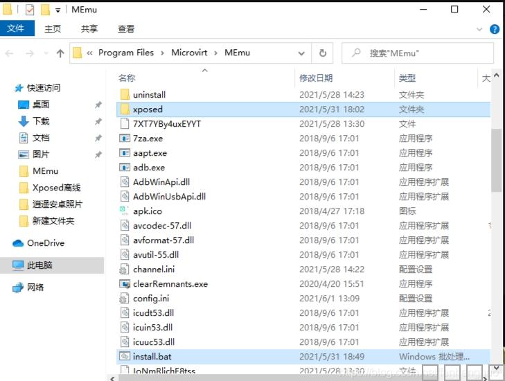 找到模拟器(这里是逍遥模拟器)的目录(鼠标右键选择打开文件所在位置),把文档内的xposed文件夹和install.bat